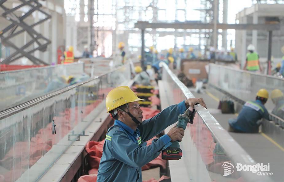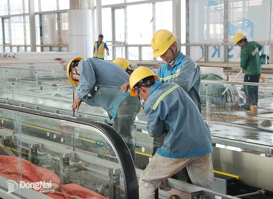 Hệ thống thang bộ hành bên trong nhà ga hành khách Sân bay Long Thành đang được triển khai lắp đặt. Ảnh: Phạm Tùng