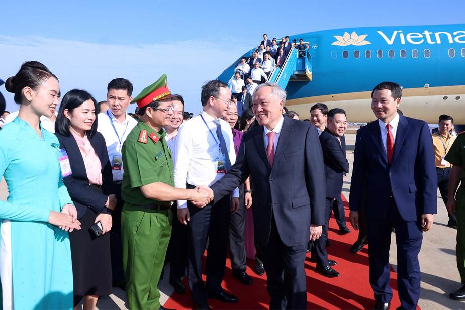 Ủy viên Bộ Chính trị, Phó Thủ tướng Thường trực Chính phủ Nguyễn Hòa Bình cùng các vị khách trên chuyến bay đặc biệt đầu tiên hạ cánh xuống Sân bay quốc tế Long Thành, sáng 19-12. Ảnh: TTXVN