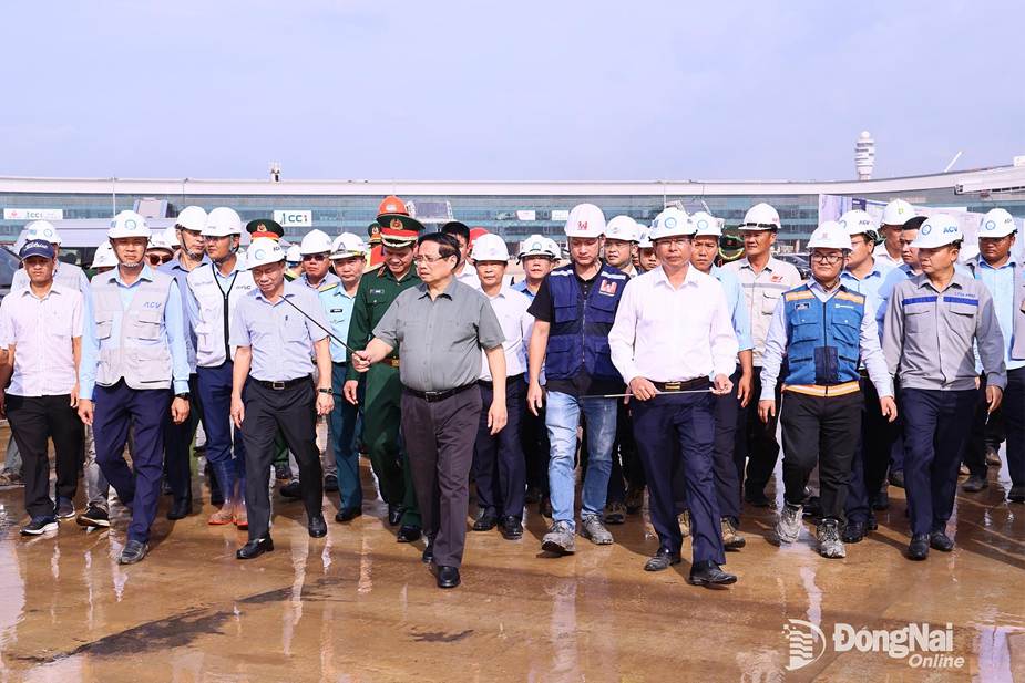 Thủ tướng Chính phủ Phạm Minh Chính kiểm tra tiến độ Dự án Cảng hàng không quốc tế Long Thành sẵn sàng cho chuyến bay đầu tiên vào ngày 19-12 tới. Ảnh: Công Nghĩa
