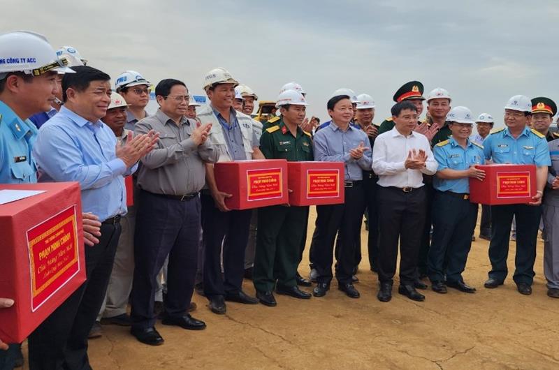 Thủ tướng Phạm Minh Chính tặng quà động viên các nhà thầu thi công dự án xây dựng sân bay Long Thành