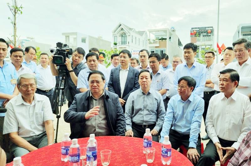 Thủ tướng Phạm Minh Chính, Phó Thủ tướng Trần Hồng Hà, Bí thư Tỉnh ủy Nguyễn Hồng Lĩnh và Chủ tịch UBND tỉnh Cao Tiến Dũng thăm hỏi các hộ dân đang sinh sống tại Khu tái định cư Lộc An - Bình Sơn