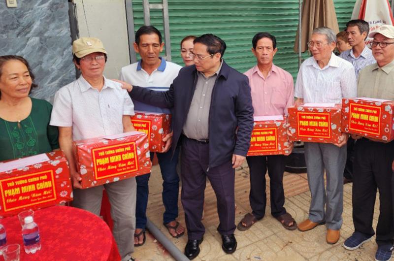 Thủ tướng Phạm Minh Chính tặng quà cho một số hộ dân sinh sống tại Khu tái định cư Lộc An - Bình Sơn