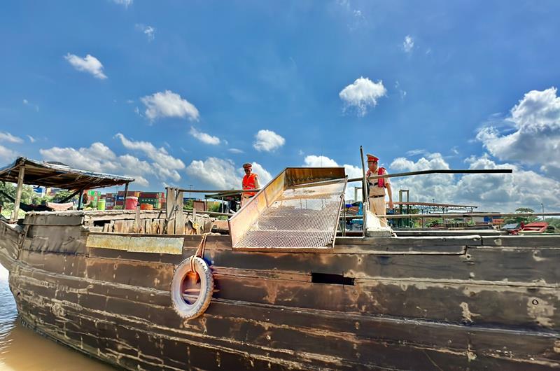 Cơ quan chức năng kiểm tra ghe gỗ sàng lọc cát bị bắt giữ rạng sáng 5-10 trên tuyến sông Đồng Nai (thuộc xã Tam An, H.Long Thành). Ảnh: Trúc Viên