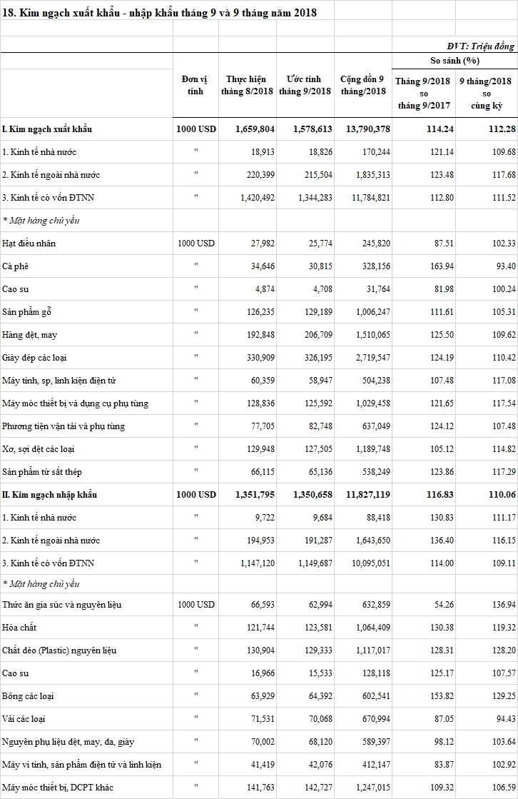 Ước kim ngạch xuất khẩu tháng 9/2018 trên địa bàn đạt 1.578,6 triệu USD, giảm 4,9% so tháng trước. Nguyên nhân kim ngạch xuất khẩu giảm so tháng trước là do trong tháng số ngày nghỉ nhiều (nghỉ lễ Quốc Khánh, thứ 7, chủ nhật) đã làm cho thời gian sản xuất và hoạt động xuất khẩu hàng hóa giảm. Dự ước 9 tháng kim ngạch xuất khẩu đạt 13.790,4 triệu USD, tăng 12,3% so cùng kỳ. Trong đó: Kinh tế nhà nước đạt 170,2 triệu USD, tăng 9,7%; Kinh tế ngoài nhà nước đạt 1.835,3 triệu USD, tăng 17,7%; Kinh tế có vốn đầu tư nước ngoài đạt 11.784,8 triệu USD, tăng 11,5%. Kim ngạch xuất khẩu 9 tháng tăng là do giá thị trường xuất khẩu thuận lợi doanh nghiệp ký được nhiều hợp đồng xuất khẩu, mặt khác giá xuất khẩu một số mặt hàng chủ lực tăng, như: Giày dép đạt (+10,4%); Dệt may (+9,6%); Máy vi tính, sản phẩm điện tử và linh kiện (+17,1%); Máy móc thiết bị, dụng cụ phụ tùng (+17,5%); Xơ, sợi dệt (+14,8%); Sản phẩm từ thép (+17,3%)… so cùng kỳ. Bên cạnh đó giá xuất khẩu các mặt hàng nông sản như cà phê, hạt tiêu, cao su, hạt điều giá xuất khẩu tiếp tục có xu hướng giảm do ảnh hưởng của tình hình thế giới, cụ thể: Giá cà phê hiện còn ở mức 1.702 USD/tấn, giảm 22%; hạt Điều giá đang ở mức 8.461 (USD/tấn), giảm 16,3%; giá hạt Tiêu là mặt hàng giảm mạnh nhất hiện chỉ còn 3.121 USD/tấn, giảm 38,7% so với cùng kỳ. Ước kim ngạch nhập khẩu tháng 9 năm 2018 đạt 1.350,6 triệu USD, giảm 0,1% so tháng trước. Dự ước 9 tháng đạt 11.827,1 triệu USD, tăng 10,1% so cùng kỳ. Trong đó: Kinh tế nhà nước đạt 88,4 triệu USD, tăng 9,2%; Kinh tế ngoài nhà nước đạt 1.643,6 triệu USD, tăng 16,2%; Kinh tế có vốn đầu tư nước ngoài đạt 10.095 triệu USD, tăng 9,1%.
