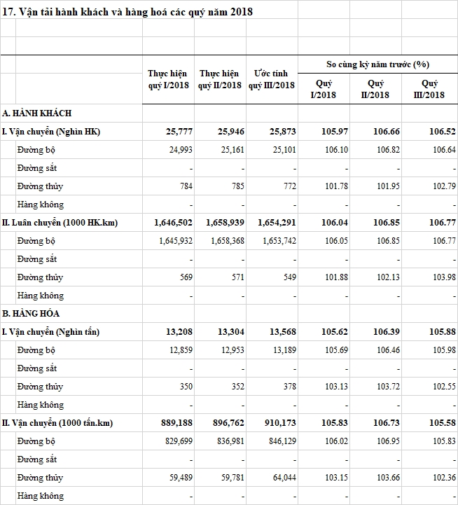 Vận tải hành khách và hàng hoá các quý năm 2018