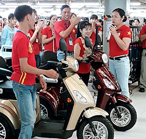 Người lao động khuyết tật Công ty Saitex International nhận xe điện do công ty hỗ trợ.