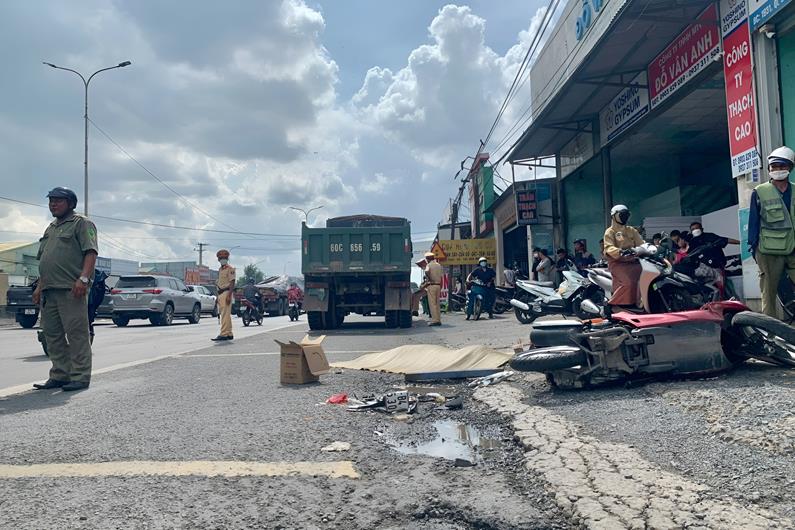 Hiện trường vụ tai nạn giao thông tại nút giao quốc lộ 51 - Bùi Văn Hòa (TP.Biên Hòa) giữa xe tải ben và xe máy khiến 1 người phụ nữ 72 tuổi ngồi sau xe máy tử vong Ảnh: Trúc Viên