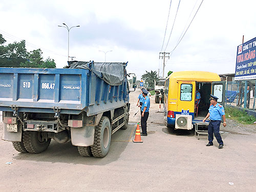 Thanh tra giao thông kiểm tra tải trọng xe tải khu vực mỏ đá Tân Cang (TP. Biên Hòa).
