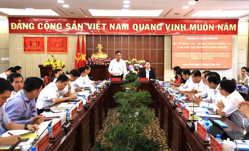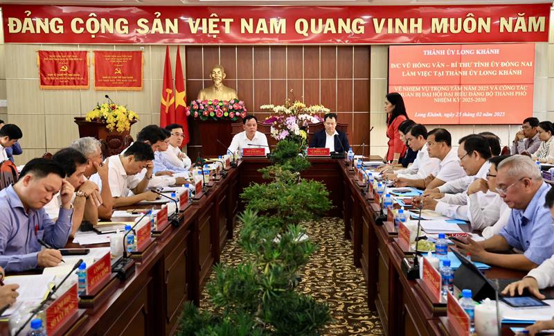 Đối với công tác chuẩn bị đại hội Đảng nhiệm kỳ 2025 - 2030, Bí thư Tỉnh ủy Vũ Hồng Văn nhấn mạnh, Long Khánh là địa phương được Ban Thường vụ Tỉnh ủy chọn làm đơn vị tổ chức đại hội điểm, do đó, Long Khánh cần tập trung chuẩn bị thực hiện chu đáo Đại hội để các Đảng bộ trực thuộc đến dự và học tập kinh nghiệm.