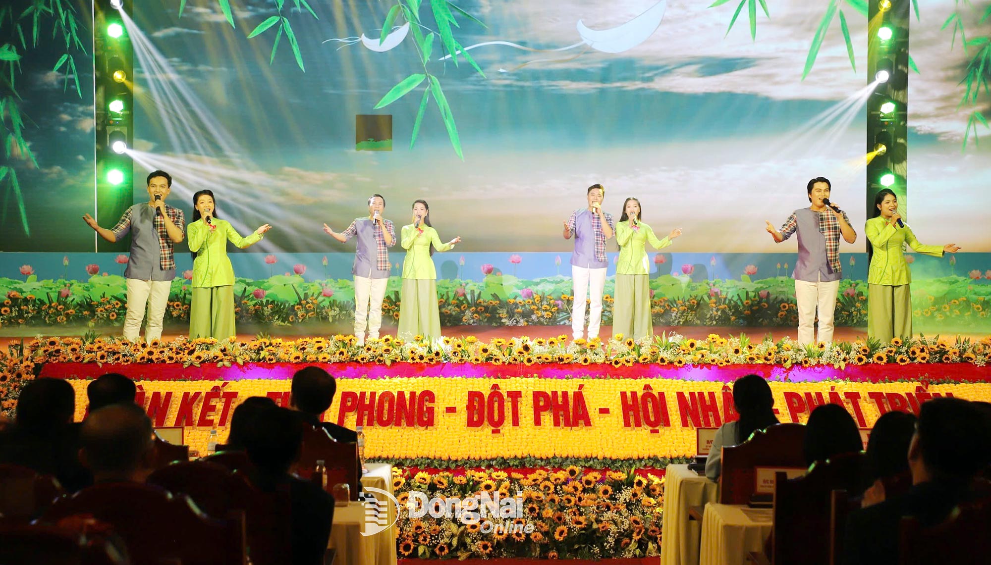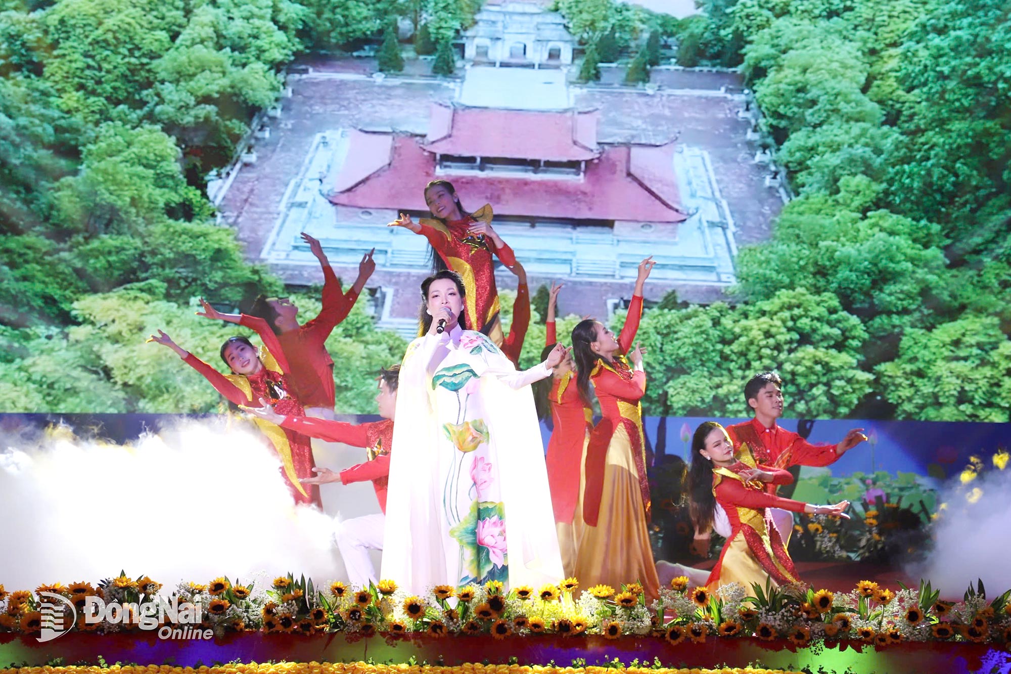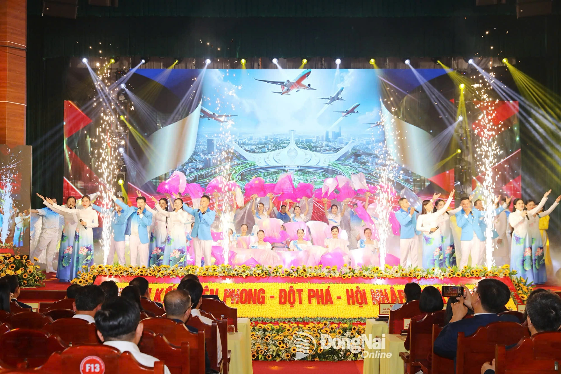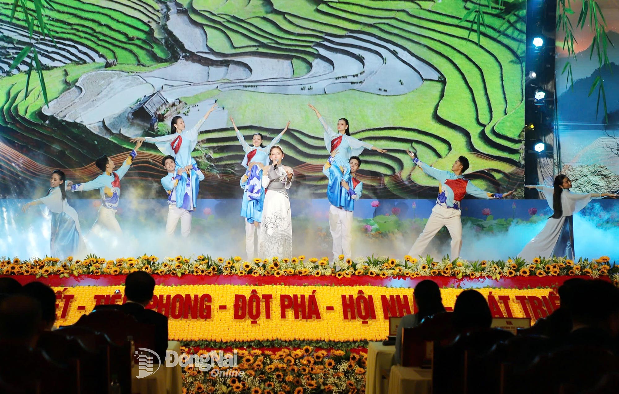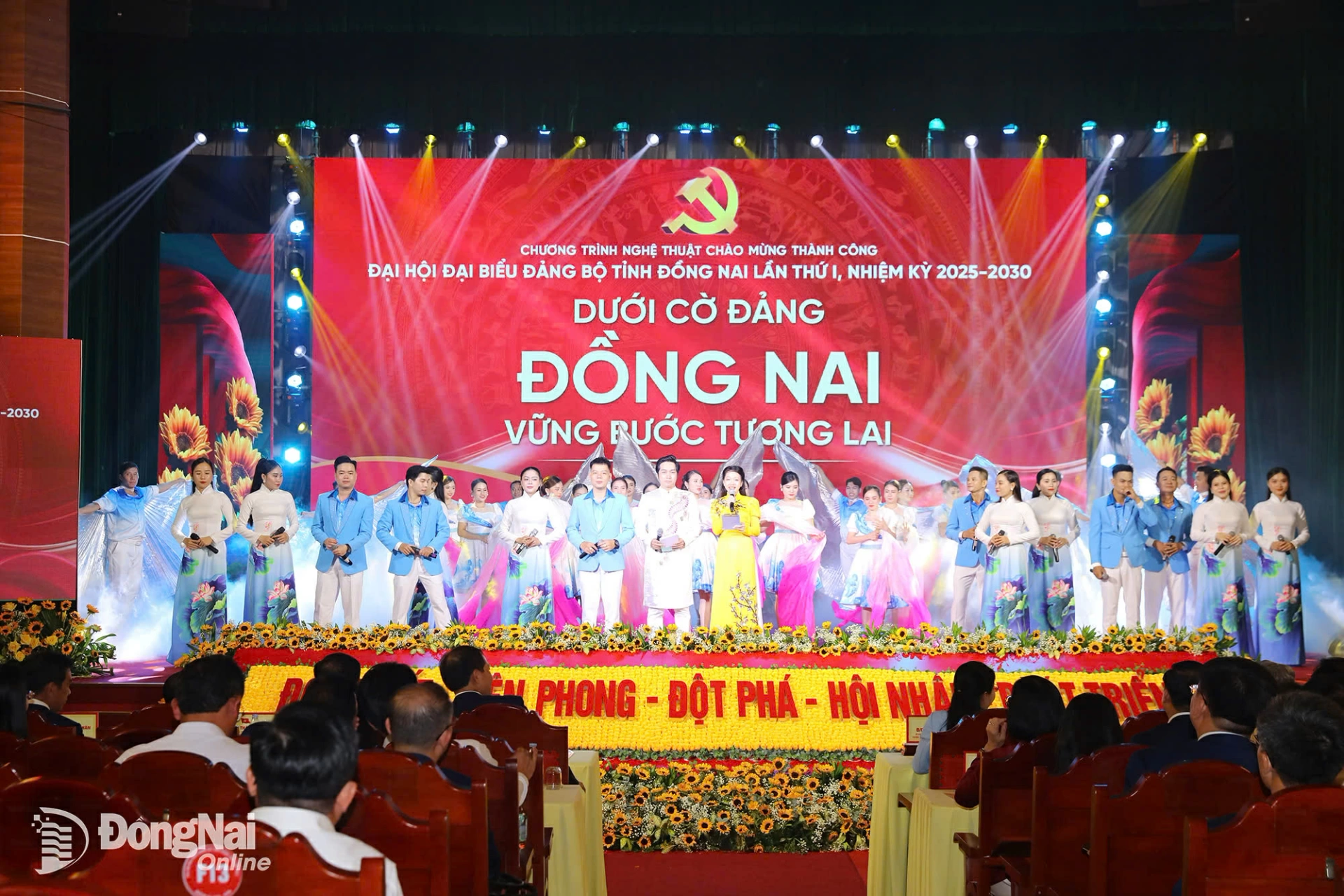 Với chủ đề: Dưới cờ Đảng - Đồng Nai vững bước tương lai, chương trình nghệ thuật gồm 12 tiết mục ca múa nhạc: Ca ngợi Đảng Cộng sản Việt Nam, Lời Đảng hiệu triệu trái tim, Con đường Bác - Đường Hồ Chí Minh, Việt Nam tự hào tiếp bước tương lai, Đón bình minh, Tình yêu đất nước tôi…
