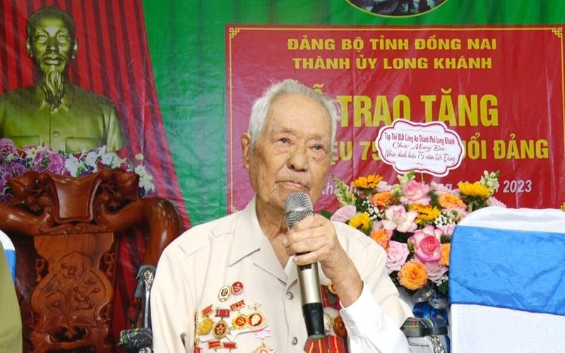 (CTT- Đồng Nai) - Phát biểu tại buổi lễ trao Huy hiệu 75 năm tuổi Đảng cho đồng chí Nguyễn Việt Trân diễn ra chiều tối 20-11, Bí thư Thành ủy Long Khánh Đặng Minh Nguyệt chúc mừng và mong muốn đồng chí tiếp tục sống vui, sống khỏe, nêu gương sáng của người Đảng viên Cộng sản cho con, cháu và thế hệ trẻ noi theo; góp phần xây dựng TP.Long Khánh giàu đẹp, văn minh, thực hiện thắng lợi các nghị quyết của Đảng.