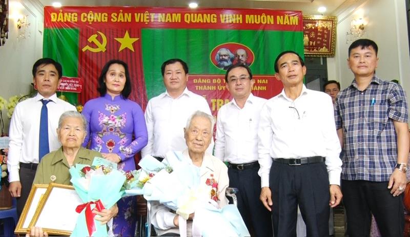 Bí thư Thành ủy Long Khánh trao Huy hiệu Đảng và chụp hình cùng lãnh đạo Tổng Công ty Cao su Đồng Nai và gia đình đảng viên Nguyễn Việt Trân