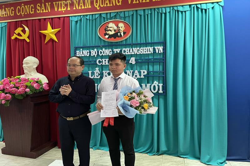 Phó bí thư Tỉnh ủy Quản Minh Cường trao quyết định kết nạp đảng viên mới cho đảng viên Chi bộ 4, thuộc Đảng bộ Công ty TNHH Chang Shin Việt Nam.