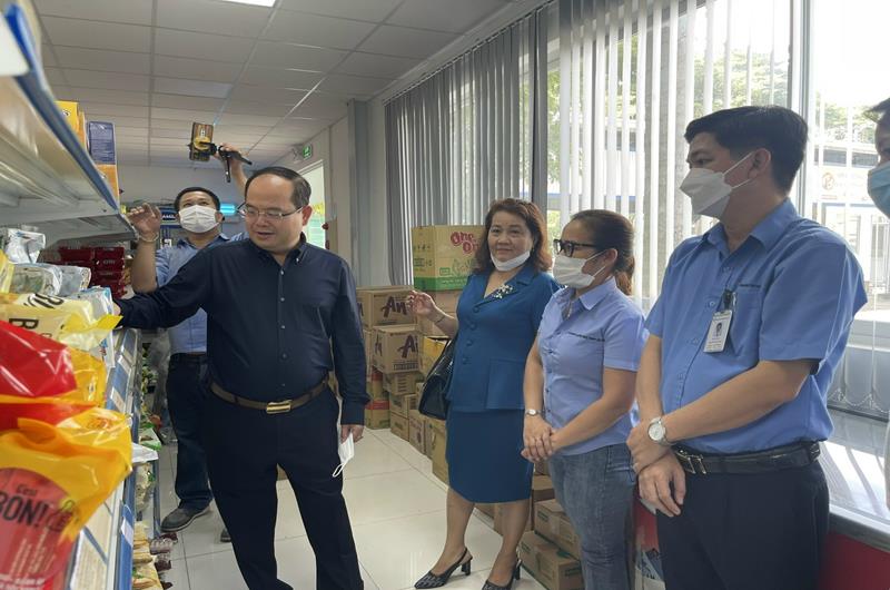 Phó bí thư Tỉnh ủy Quản Minh thăm cửa hàng bình ổn giá, bán hàng giá gốc cho công nhân.