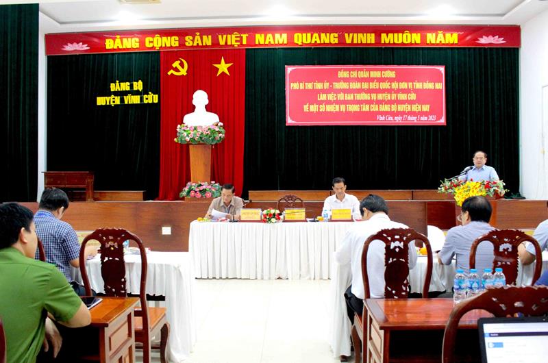 Phó Bí thư Tỉnh ủy, Trưởng Đoàn đại biểu Quốc hội tỉnh Quản Minh Cường nói chuyện chuyên đề về bảo vệ nền tảng tư tưởng của Đảng với đội ngũ cán bộ chủ chốt, bí thư chi bộ các ấp, khu phố tại huyện Vĩnh Cửu