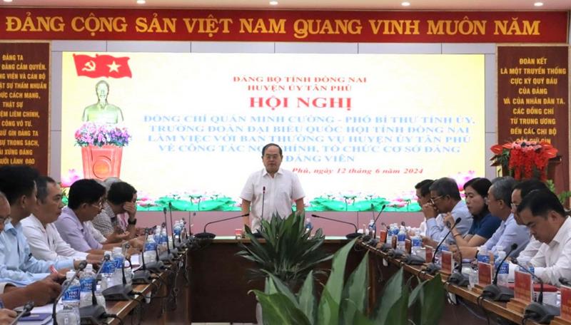 Phát biểu tại buổi làm việc, Phó Bí thư Tỉnh ủy ghi nhận, đánh giá cao kết quả đạt được của huyện và đề nghị, Huyện ủy Tân Phú không được chủ quan, chủ động nắm chắc tình hình, tiếp tục lãnh đạo, kịp thời phát hiện, ngăn chặn để không xảy ra những vụ việc gây mất an ninh trật tự, tạo sự ổn định để phát triển. Đồng chí đặc biệt lưu ý, Huyện ủy Tân Phú phải hết sức quan tâm, sâu sát cơ sở, nắm tình hình cơ sở để hiểu dân, tin dân và phát huy vai trò “tai mắt” của dân trong lãnh đạo thực hiện hiệu quả nhiệm vụ, nhất là công tác nội chính, TCCSĐ, đảng viên, tạo sự ổn định góp phần phát triển xã hội, kinh tế, nâng cao đời sống Nhân dân…