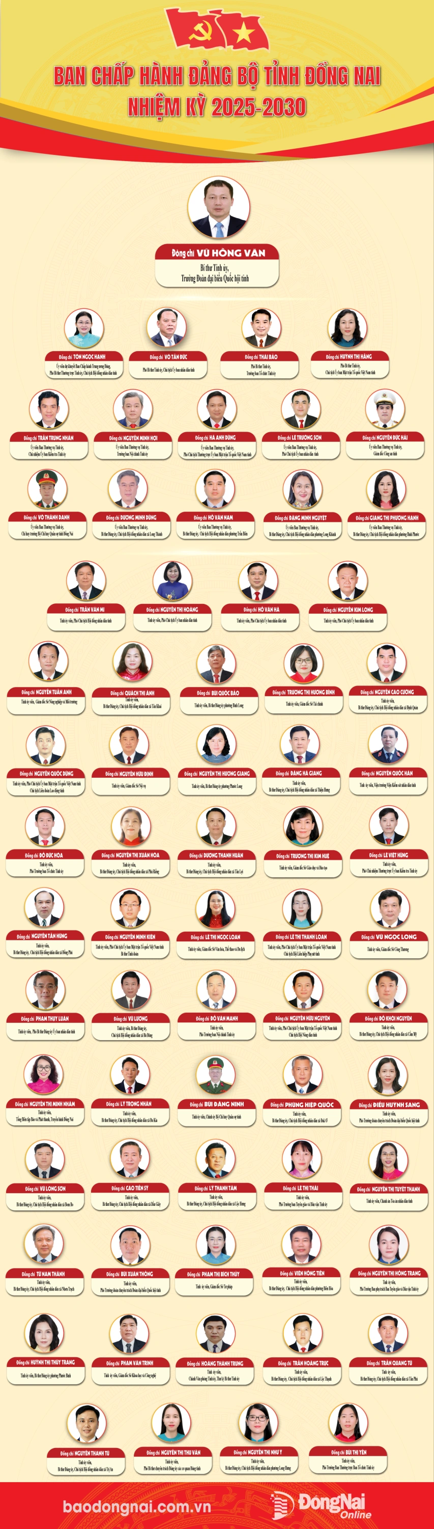 Phiên chính thức Đại hội đại biểu Đảng bộ tỉnh Đồng Nai lần thứ I, nhiệm kỳ 2025-2030 diễn ra ngày 30-9, đã công bố Quyết định của Bộ Chính trị chỉ định tham gia Ban Chấp hành, Ban Thường vụ Tỉnh ủy, Ủy ban Kiểm tra Tỉnh ủy Đồng Nai nhiệm kỳ 2025-2030. Theo đó, Bộ Chính trị chỉ định tham gia Ban Thường vụ Tỉnh ủy gồm 15 đồng chí, Ban Chấp hành Đảng bộ tỉnh gồm 68 đồng chí và Ủy ban Kiểm tra Tỉnh ủy gồm 11 đồng chí.
