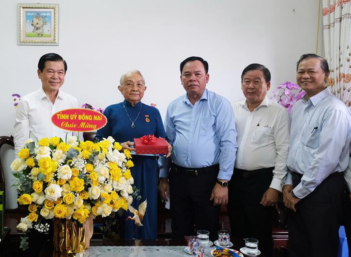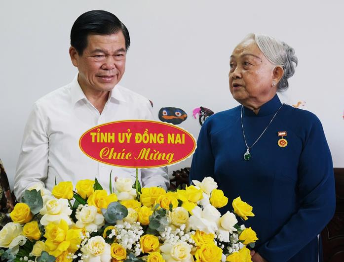 Bí thư Tỉnh ủy Nguyễn Hồng Lĩnh thăm hỏi, chúc mừng đồng chí Trần Thị Minh Hoàng, nguyên Ủy viên Trung ương Đảng, nguyên Bí thư Tỉnh ủy Đồng Nai vinh dự được nhận Huy hiệu 60 năm tuổi Đảng.