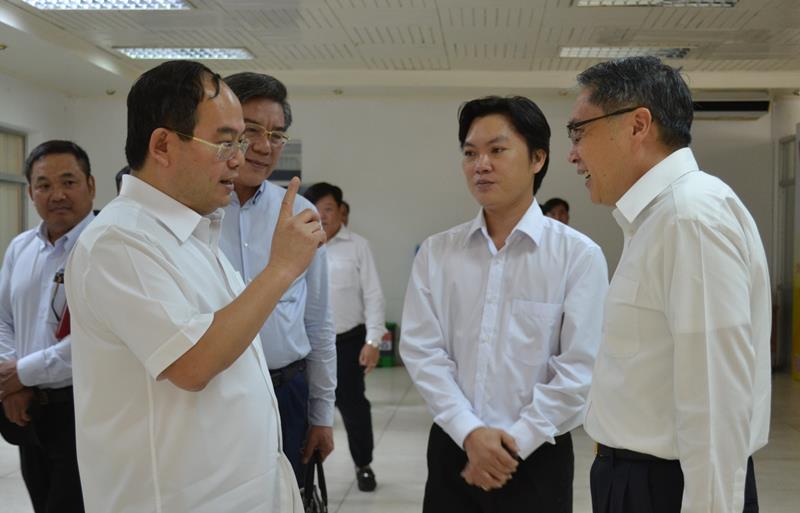 Phó Bí thư Tỉnh ủy Quản Minh Cường (bên trái ) gặp gỡ lãnh đạo Công ty cổ phần hữu hạn Vedan Việt Nam.