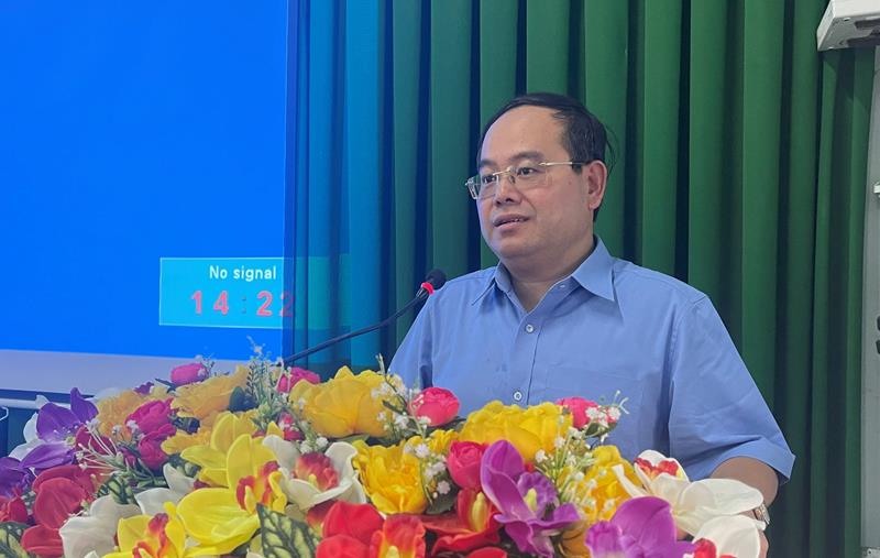 Phó Bí thư Tỉnh ủy Quản Minh Cường phát biểu tại buổi sinh hoạt với đảng viên Chi bộ ấp Phước Hòa.