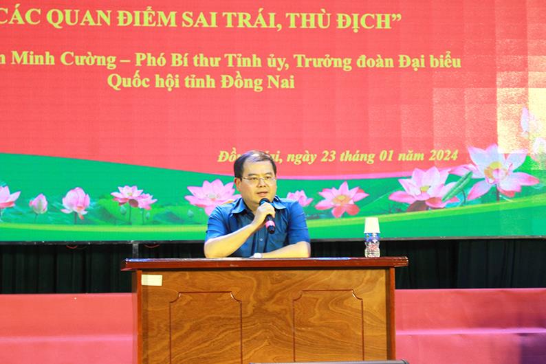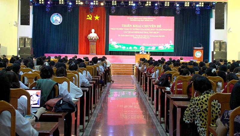 (CTT-Đồng Nai) - Chiều 23-1, Phó Bí thư Tỉnh ủy, Trưởng Đoàn đại biểu Quốc hội tỉnh Quản Minh Cường đã có buổi nói chuyện chuyên đề về bảo vệ nền tảng tư tưởng của Đảng, đấu tranh phản bác các quan điểm sai trái thù địch cho cán bộ, đảng viên, giảng viên, sinh viên của Trường Đại học Đồng Nai.