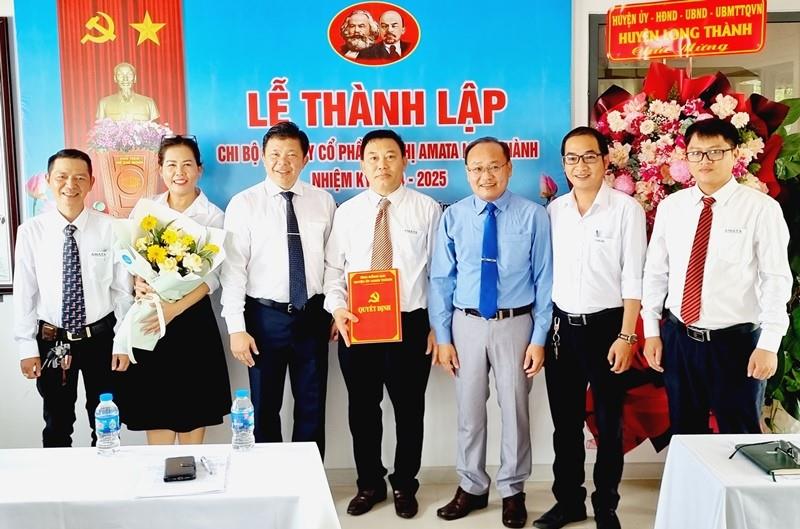 Phó Bí thư thường trực Huyện ủy Long Thành Huỳnh Minh Dũng (thứ 3 từ phải qua) chúc mừng Chi bộ cơ sở Công ty cổ phần Đô thị Amata Long Thành được thành lập.