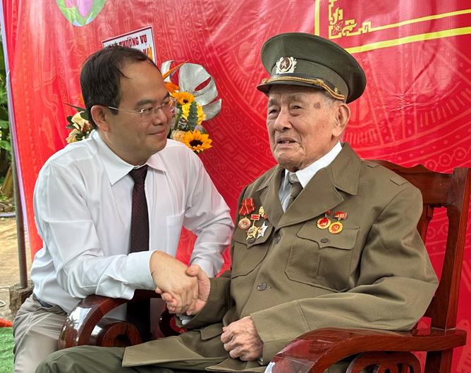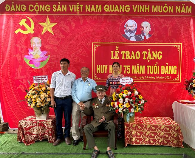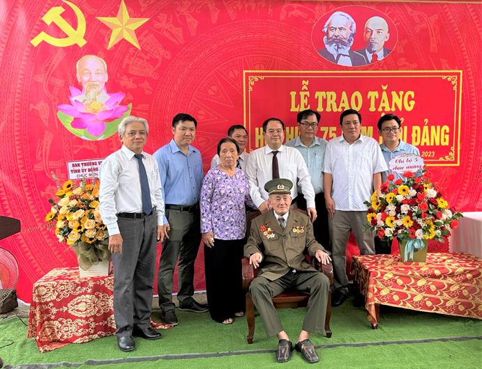 (CTT-Đồng Nai)- Chiều 5-10, Phó Bí thư Tỉnh ủy, Trưởng Đoàn đại biểu Quốc hội tỉnh Quản Minh Cường đã tới dự và trao tặng Huy hiệu 75 năm tuổi Đảng cho đảng viên Hoàng Giang, hiện đang sinh hoạt Đảng tại Chi bộ ấp 5, trực thuộc Đảng bộ xã Sông Trầu, H.Trảng Bom.