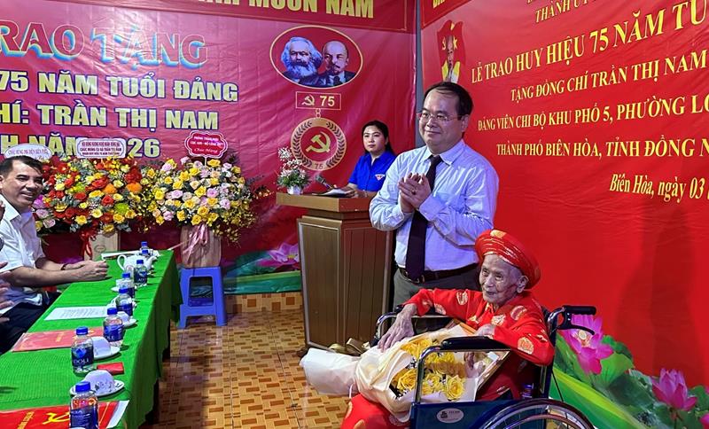 (CTT-Đồng Nai) - Chiều 3-10, Phó Bí thư Tỉnh ủy, Trưởng Đoàn đại biểu Quốc hội (ĐBQH) tỉnh Quản Minh Cường đã chủ trì buổi lễ trao tặng Huy hiệu 75 năm tuổi Đảng cho đảng viên Trần Thị Nam, hiện đang sinh hoạt Đảng tại Chi bộ KP5, trực thuộc Đảng bộ P.Long Bình, thuộc Đảng bộ TP.Biên Hòa.