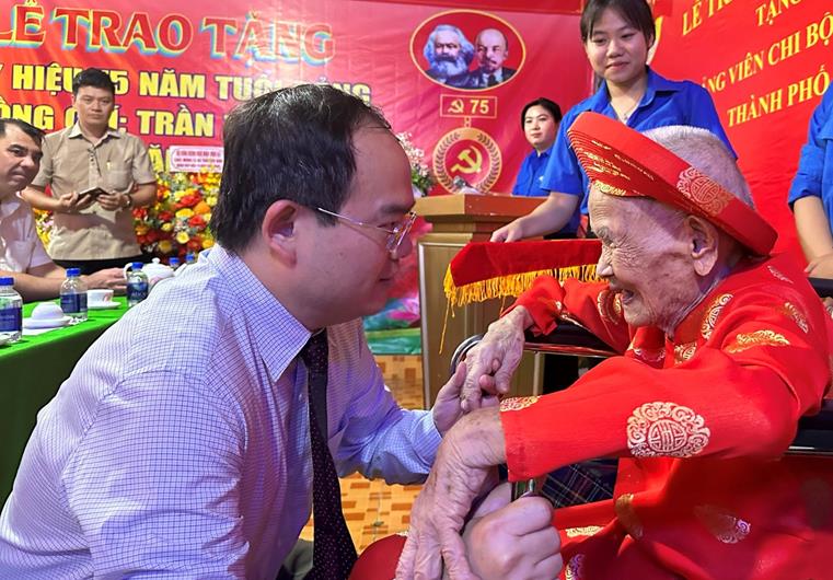 Phó Bí thư Tỉnh ủy Quản Minh Cường, trao Huy hiệu 75 năm tuổi Đảng cho đảng viên Trần Thị Nam.