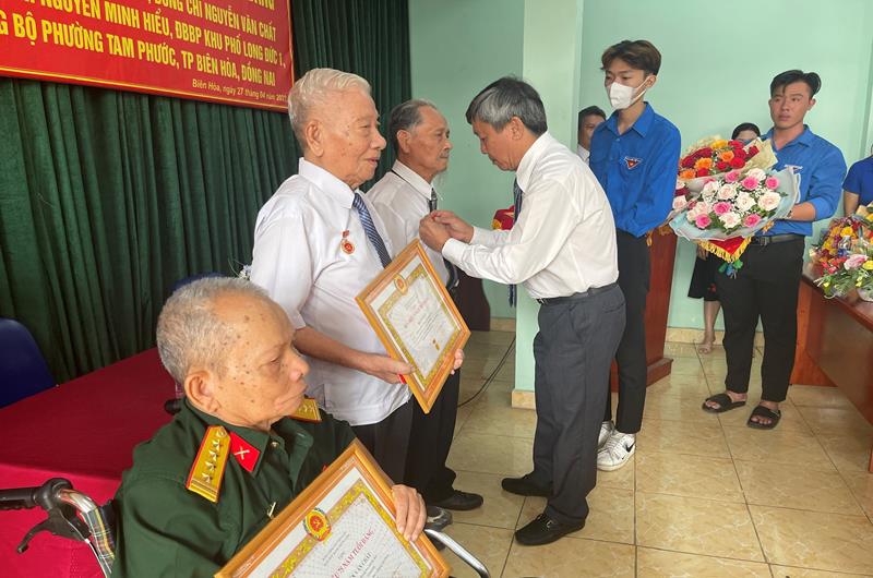 Đảng viên Nguyễn Minh Hiểu, Chi bộ 5, được trao Huy hiệu 70 năm tuổi Đảng. Ông Hiểu năm nay 91 tuổi, được kết nạp vào Đảng năm 1953, quê tỉnh Thanh Hóa. Từ năm 1951- 1969, ông là bộ đội, tham gia chiến đấu thuộc Bộ Tư lệnh Phòng không, không quân và giữ các chức vụ: Chính trị viên, Bí thư Chi bộ Tham mưu; sau đó do sức khỏe yếu, ông về hưu và tham gia công tác tại địa phương; đến năm 2000, chuyển vào Đồng Nai sinh sống. Quá trình công tác, ông đã được Chủ tịch nước và Bộ trưởng Bộ Quốc phòng tặng thưởng nhiều huân chương, huy chương.