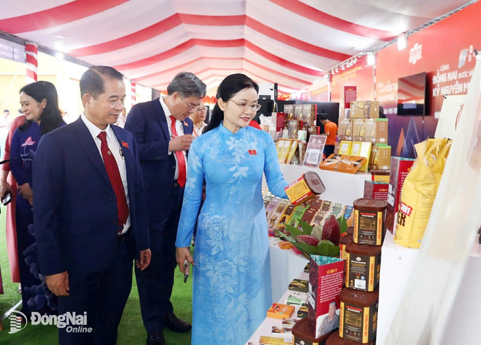 | Lãnh đạo tỉnh Đồng Nai tham quan gian hàng trưng bày sản phẩm OCOP bên lề đại hội. Ảnh: Huy Anh |