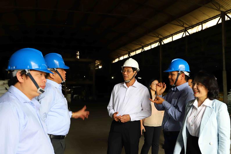 Thứ trưởng Bộ Nông nghiệp và Phát triển nông thôn Trần Thanh Nam (bìa trái) tham quan nhà máy sản xuất phân bón tại Công ty TNHH Trang Trại Việt