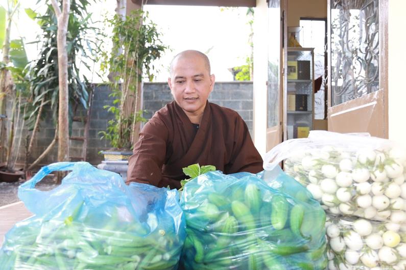 Đại đức Thích Pháp Đăng, Trưởng Ban Trị sự Giáo hội Phật giáo Việt Nam H.Thống Nhất, Trụ trì chùa Huệ Viễn (xã Hưng Lộc) phân chia rau củ được phật tử ủng hộ thành từng phần nhỏ để chia cho người khó khăn