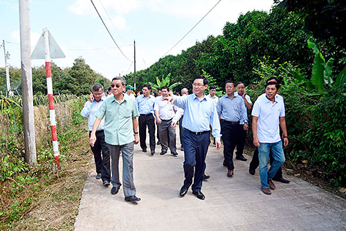 Phó Thủ tướng Chính phủ Vương Đình Huệ (giữa) thăm một tuyến đường giao thông nông thôn tại ấp Bàu Tre, xã Bình An, huyện Long Thành.