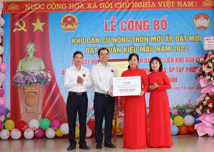 Dịp này, UBND huyện trao bảng công nhận khu dân cư nông thôn mới ấp Đất Mới đạt chuẩn kiểu mẫu, đồng thời UBND tỉnh trao tặng số tiền 200 triệu đồng.