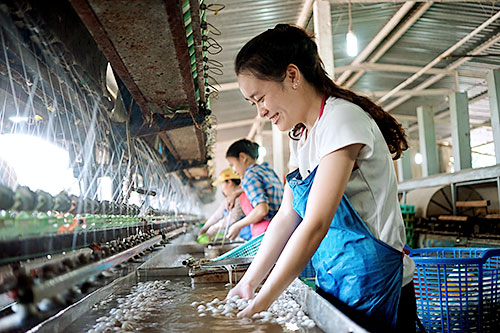 Công nhân sản xuất sợi dệt tại một cơ sở sản xuất ở xã Phú Trung, huyện Tân Phú.