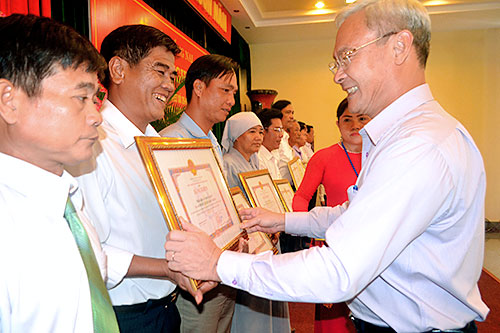 Bí thư Tỉnh ủy Nguyễn Phú Cường trao bằng khen cho các tập thể, cá nhân đạt thành tích xuất sắc.