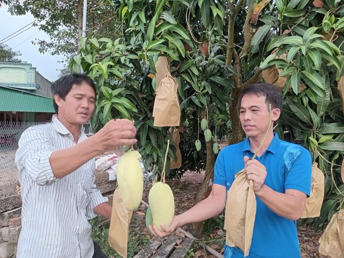 Nông dân Tư Phúc (tay phải, xóm Miền Tây, ấp 2, xã Xuân Hòa, H.Xuân Lộc) hái xoài biếu khách về chưng Tết
