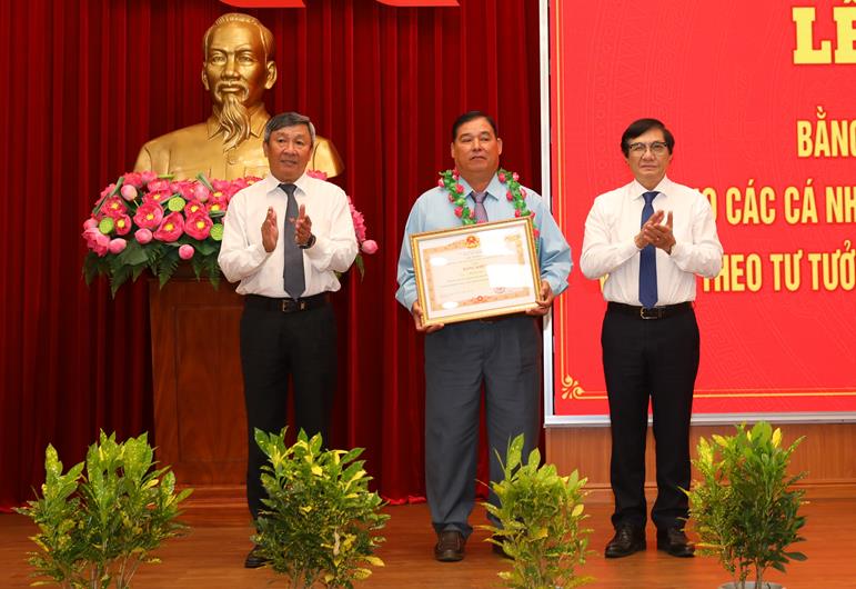 Phó Bí thư Thường trực Tỉnh ủy Hồ Thanh Sơn và Phó Chủ tịch UBND tỉnh Nguyễn Sơn Hùng, trao bằng khen của Thủ tướng Chính phủ cho ông Phạm Văn Ray.