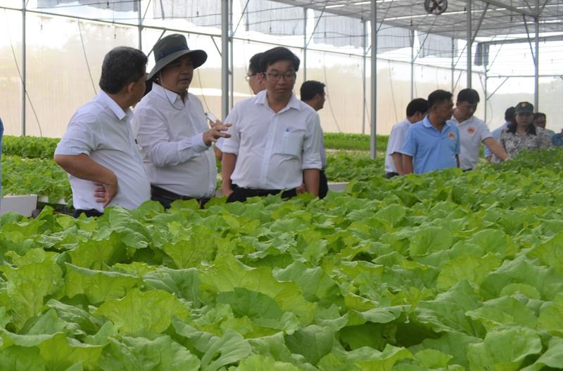 Lãnh đạo các cơ quan, đơn vị của tỉnh thăm mô hình sản xuất rau sạch theo hướng hữu cơ ở huyện Vĩnh Cửu.