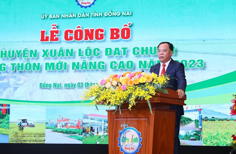 Quyền Chủ tịch UBND tỉnh Võ Tấn Đức phát biểu tại lễ công bố huyện Xuân Lộc đạt huyện nông thôn mới nâng cao năm 2023