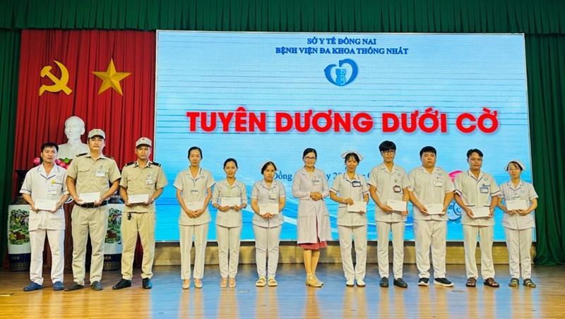 Phó Giám đốc Bệnh viện Đa khoa Thống Nhất Nguyễn Thị Kim Loan khen thưởng các điều dưỡng, hộ lý, bảo vệ