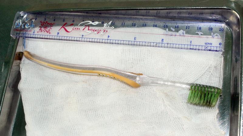 Một trường hợp khác là bệnh nhi nữ 13 tuổi, ngụ H.Bắc Tân Uyên, tỉnh Bình Dương nhập viện cấp cứu sau khi nuốt phải chiếc bàn chải đánh răng.