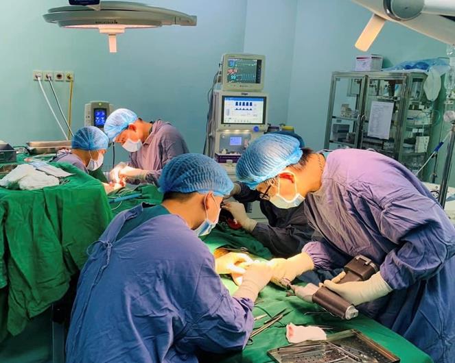 Ê kíp phẫu thuật khoa Chấn thương chỉnh hình Bệnh viện Đa khoa khu vực Long Khánh thực hiện ca phẫu thuật vi phẫu nối ngón tay đứt lìa cho bệnh nhân