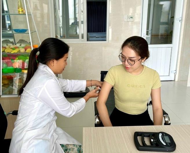 Bác sĩ đo lớp mỡ dưới da cho khách hàng