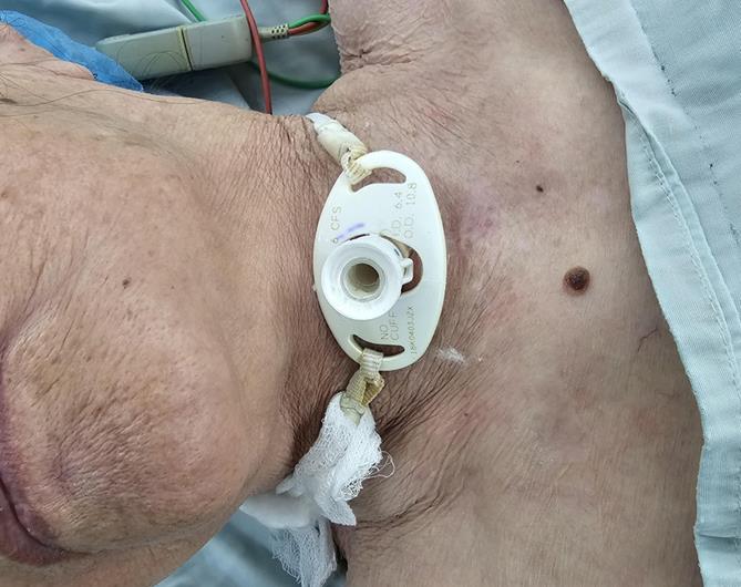 Bà B. nhập viện trong tình trạng đeo ống mở khí quản ở cổ hơn một năm qua do di chứng của bệnh nhồi máu não cũ, không nói được, không ăn uống bình thường được, đàm và dịch liên tục chảy ra ống mở khí quản khiến bà khó thở.
