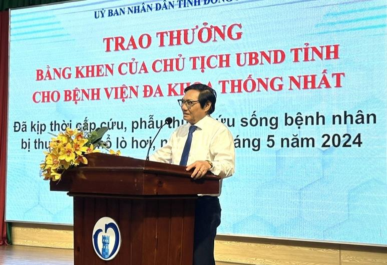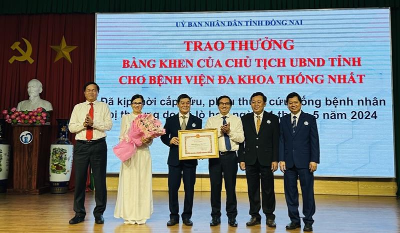 (CTT-Đồng Nai) - Ngày 22-5, Phó Chủ tịch UBND tỉnh Nguyễn Sơn Hùng đã trao tặng bằng khen của Chủ tịch UBND tỉnh cho tập thể Bệnh viện Đa khoa Thống Nhất vì đã kịp thời phẫu thuật cứu sống các bệnh nhân bị thương trong vụ tai nạn nổ lò hơi ngày 1-5 tại huyện Vĩnh Cửu.