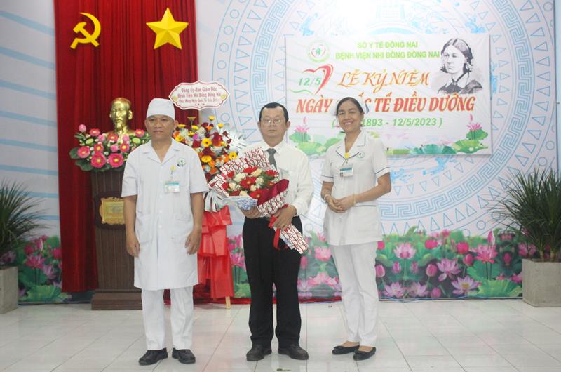 Lãnh đạo Bệnh viện Nhi đồng Đồng Nai, Trưởng phòng Điều dưỡng bệnh viện tặng hoa tri ân ThS.Huỳnh Tú Anh, Phó Chủ tịch Hội Điều dưỡng Việt Nam, Chủ tịch Hội Điều dưỡng tỉnh