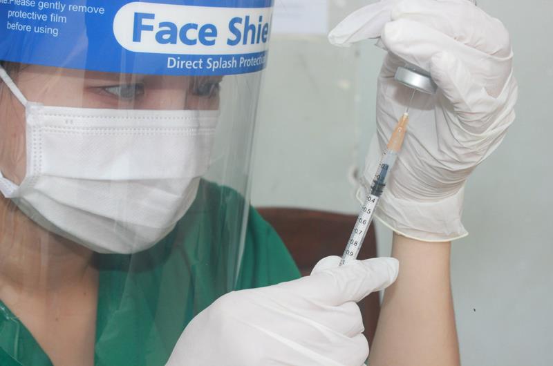 Nhân viên y tế rút vaccine Covid-19 từ lọ để tiêm cho người dân