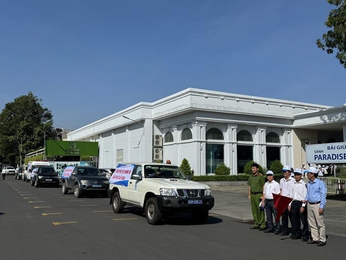 Các đại biểu phất cờ để đoàn xe mang theo các thông điệp tuyên truyền về phòng, chống HIV/AIDS di chuyển trên các tuyến phố của thành phố Biên Hòa.